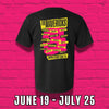 This black short sleeve tee features a graphic of The Mavericks on the front with text that reads, "Moon & Stars Tour '24". The back features a matching yellow and pink graphic with all of the stops of the tour.