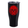 This stainless steel black tumbler features the red Mavericks' Skull.