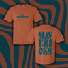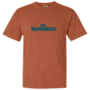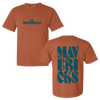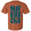 This burnt-orange t-shirt features groovy, teal text that reads, "The Mavericks" on the front and back of the shirt.